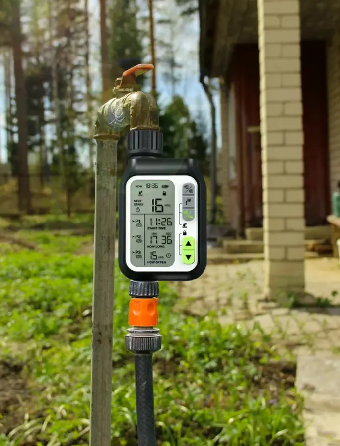 A compact digital timer that uses a microcomputer system to control watering cycles precisely.